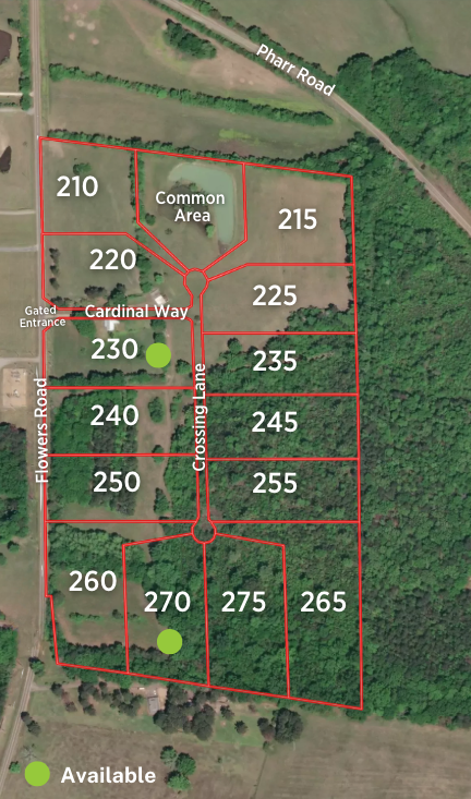 Cardinal Crossing is a beautiful estate lot development in Pike Road, Alabama, offering a limited number of spacious residential homesites. This private, gated community features a community lake and gazebo, creating a tranquil setting for living. Conveniently located off Flowers Road near the intersection of Vaughn Road (Hwy 110), it remains the only gated neighborhood of its kind in this area of Pike Road. Enjoy easy access to shopping and dining, while embracing a private, rural lifestyle surrounded by natural beauty. Lots range from 3.91+/- to 5.85+/- acres, with stunning homesites nestled among mature trees. A few residents have already built and are calling Cardinal Crossing home, adding to the welcoming sense of an emerging community. Zoned for the highly regarded Pike Road Schools. Bring your own builder and create your dream home on your own timeline—no rush, just endless possibilities.