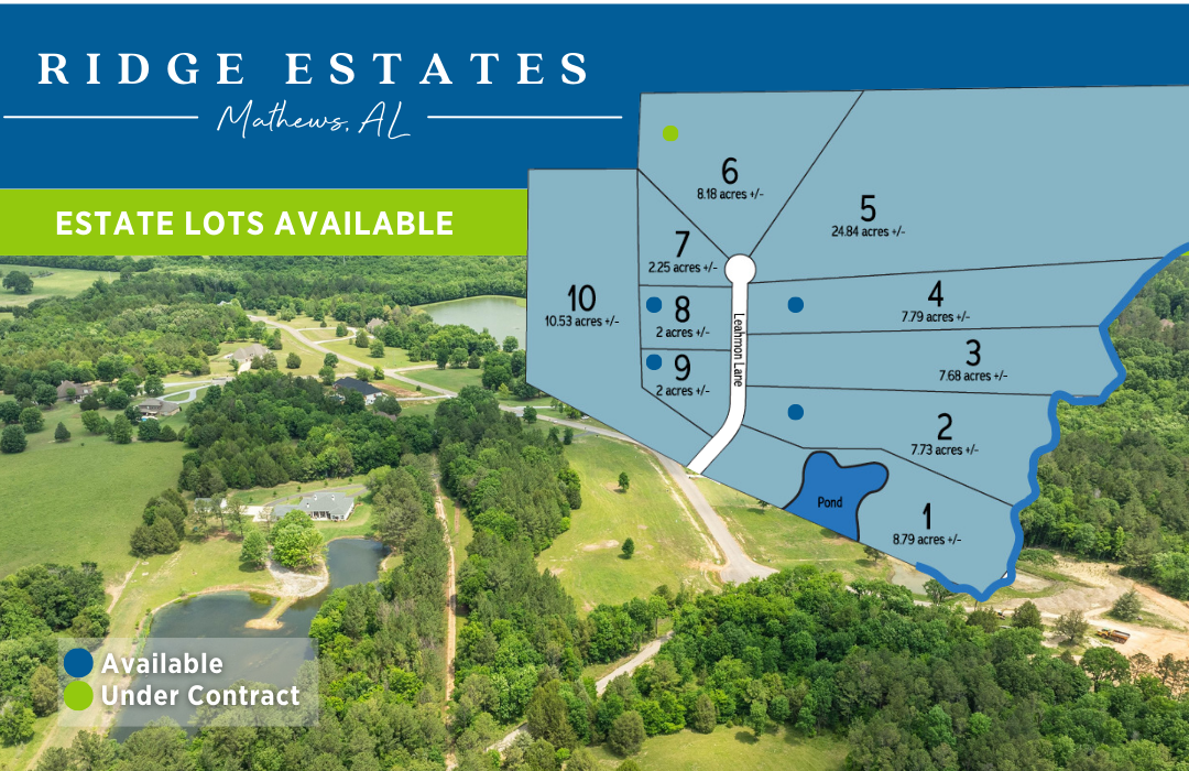 Enjoy the convenience of being close to town while also enjoying the sights and sounds of private rural living at The Ridge Estates in Mathews, Alabama. Located in Montgomery County, Ridge Estates homesites are located just a short 10-15 minute drive from The Shops at Pike Road and many other shopping and dining options. A limited number of estate lots are now available! Acreage of lots ranges from 2 +/-acres to 25+/- acres. Bring your own builder and build on your own timeline.  Rural land in a perfect setting!